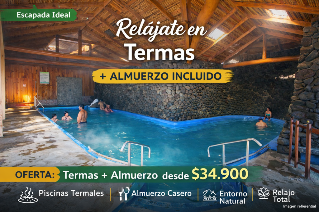 Disfruta un día completo de relajo en Termas Montevivo, rodeada de naturaleza, con almuerzo casero incluido.